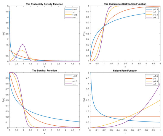 where is the shape parameter and is the rate parameter. Figure 1 shows the different representative plots of , , and for WEI) given . The shape of the WEI) failure rate function depends upon the value of the shape parameter, . When , the failure rate is increasing and concave up. When , the failure rate is decreasing and concave up. When , it reduces to a horizontal line that is the failure rate shape of the well-known conventional exponential distribution. Due to the flexibility of the failure rate function, WEI) has been proposed in statistics literature to analyze real applications for industrial and engineering reliability inference and medical survival analysis.