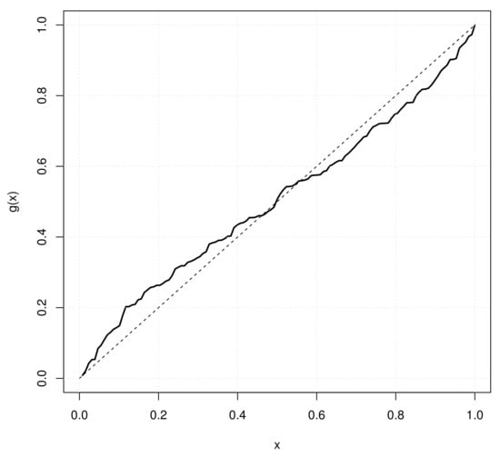 The data set from Table 4 is used to fit WEI and the MLEs of the unknown and of WEI are obtained as and . The K-S test with a significance level of 0.05 provides the test statistic value 0.061136 and p-value = 0.8489. Figure 3 shows the empirical scaled TTT plot of the 100 breaking stresses of carbon fibers and indicates a concave shape. It means that the hazard function is an increasing function and shape parameter must be greater than 1. The MLE of presents a consistent conclusion. Hence, the Weibull distribution is accepted as a good fit probability model for the carbon fiber breaking stresses. In this application, WEI, with and , is assumed as the true distribution for the carbon fiber breaking stresses.