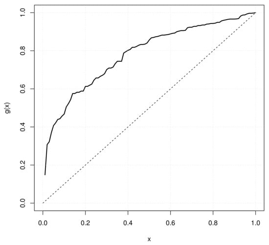 First, we use the data set from Table 3 to fit with WEI. The MLEs of the unknown and of WEI are given by and . By using the K-S test with a significance level of 0.05, the test statistic value is 0.069449 with p-value = 0.5675. Figure 2 shows the empirical scaled TTT plot of the 128 remission times of bladder cancer patients and indicates concave on the left lower part and slightly curved up on the right upper part. The MLE of is larger than 1 but very closed to 1, indicating the hazard function is an increasing or constant function. Therefore, based on the K-S test result, it is still reasonable to assume that the Weibull distribution is accepted as a good fit. The true parameters of WEI will be assumed as and in this section for the practical application purpose.