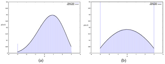 Monte Carlo results versus exact solution (only regular part). On this figure , . (a) Result for exponential distribution with, , , , . (b) Result for gamma distribution with , and .
