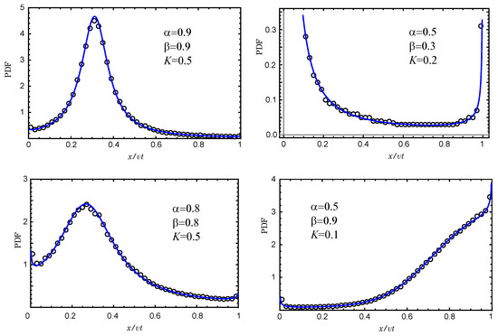 The comparison of these pdfs for different values of and K with the results of the Monte Carlo simulation is shown in Figure 7. Formula (83) perfectly describes the asymptotic distribution densities of a one-sided Lévy walk with trapping. For the simulation of waiting times and path lengths, we use densities in the form of “fractional exponentials” (see, e.g., [16]),