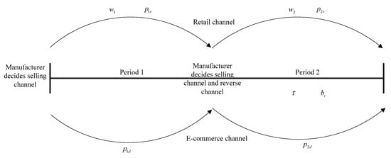 In this subsection, the authors characterize a market scenario: in the first period, new products made from raw materials are manufactured and sold to consumers and the retailer; in the second period, used products sold in the previous period are collected by the manufacturer and the retailer, and new products and remanufactured products made from collected ones are sold to consumers and the retailer. Therefore, the manufacturer and the retailer’s profit functions are: