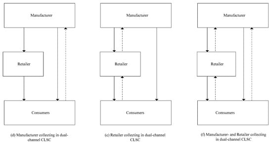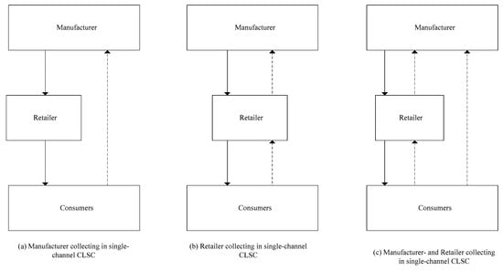 In today’s competitive business environment, approximately 68% of manufacturers in a variety of industries redesign their forward supply chain configuration through e-commerce []. Many enterprises, such as IBM, HP, Panasonic, Cisco System, Huawei, and Nike, have established a dual-channel selling mode, which is an integration of burgeoning e-commerce channel and traditional retail channel [,,,,]. Specially, Dell, which is known for its success in e-commerce mode, announced that it would build an e-commerce channel to take the advantage of both channels and to stimulate the market demands. Apple, the largest information technology company in the world, has 478 retail stores across 17 countries and operates the online App Store simultaneously. The e-commerce channel not only gives consumers lower price, unconstrained shopping time and location, various products, and efficient express delivery but also allows manufacturers to reduce trade costs and benefit from the expanded market segments [], as well as enhance control over retail price []. Meanwhile, the e-commerce channel is playing an important role in consumption markets. According to Forrester’s latest five years’ e-commerce forecast, the value of online sales was $297 billion in 2014 in the U.S., and it would grow up to $480 billion by 2019 []. “The Monitoring Report of China’s Online Retail Market Data in 2017” reported that the online market scale reached $1.07 trillion in China, which increased by 39.17% compared with the previous year and constituted 19.6% of the total sales. As e-commerce channel and retail channel sell the same products and have a competitive relationship, the structure design of CLSC with dual-selling channel has become an urgent problem. Nevertheless, to the best of our knowledge, few studies have analyzed the reverse channel design problem of CLSC considering e-commerce.