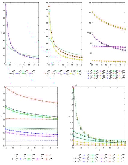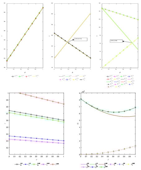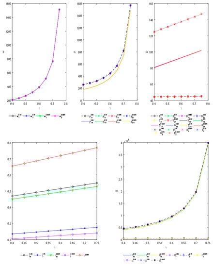 In the previous section, the authors characterized the game between players and deprived the equilibrium solutions in six scenarios, respectively. As the equilibrium solutions cannot be directly compared, the authors will present numerically. Extending the previous research [], the authors further introduce e-commerce and consider the selling channel and reverse channel strategy simultaneously. Thus, in this subsection, the authors use numerical experiments to obtain critical managerial insights. Parameters are setting as follows: , , , , , , , , , and . In all figures, the superscript “S” and “D” respectively represent the single-channel and the dual-channel. and respectively represent the market demand for single-channel in the first period and the second period. (i.e., ) and (i.e., ) respectively represent the total market demand for dual-channel in the first period and the second period. represents the total profit for supply chain.
