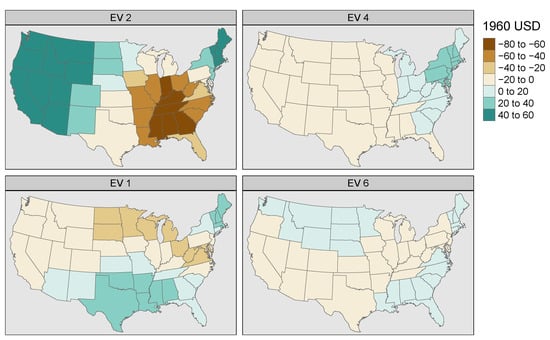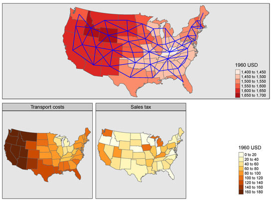 Composition of used car prices, US states. Upper panel, average used car prices in 1960 for cars that were new in 1955–1959 and graph of contiguous states shown in blue; lower panel left: transport costs of new cars; right: state taxes on new cars.