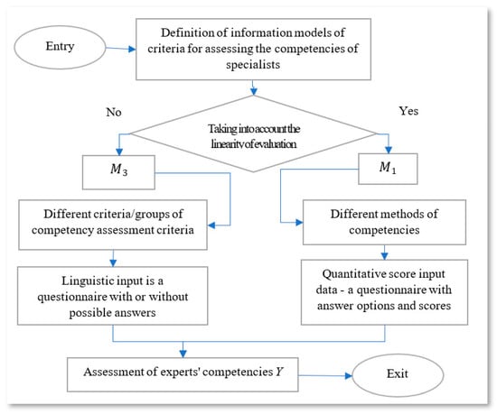 Algorithm for choosing a model for assessing the competencies of smart city specialists, taking into account the linearity of assessment processes: M1—fuzzy model for assessment of the competence of specialists; M3—neuro-fuzzy network.