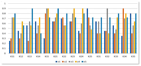 Next, we defuzzified the data and compared the levels of decision-making on the linguistic interpretation of the competencies of specialists using the activation function (14): ; 0.5048; ; ; . We built a ranking of the specialists using the obtained values: . We compared the quantitative result with the original variable Y and found that the specialists had a “specialist rating above average” and all the others had a “specialist rating—average”.