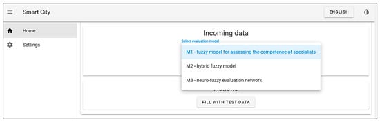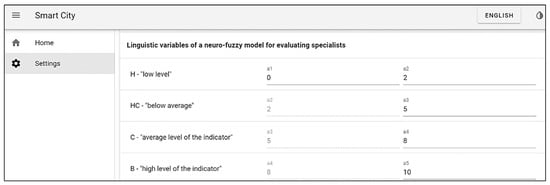 As part of the study, an innovative web platform named Smart City Concept Personnel Selection [48] was developed on the basis of the proposed technology for the evaluation and selection of specialists, as shown in Figure 6.