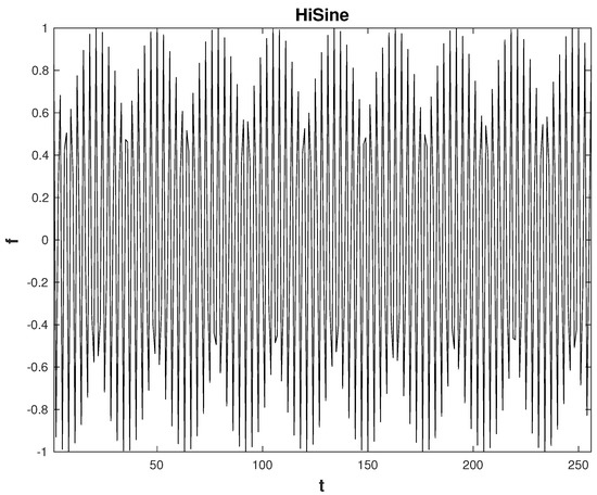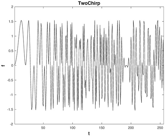 Since the proposed method deals with nominal signals with fast oscillating characteristics, we choose the HiSine and the TwoChirp signals (represented in Figure 2 and Figure 3) among the classical signals employed in the literature. Both can be well represented by using an appropriate RADWT. In particular, a RADWT with Q-factor almost 5 (, , and ) is appropriate for their sparse representation.