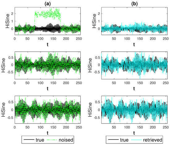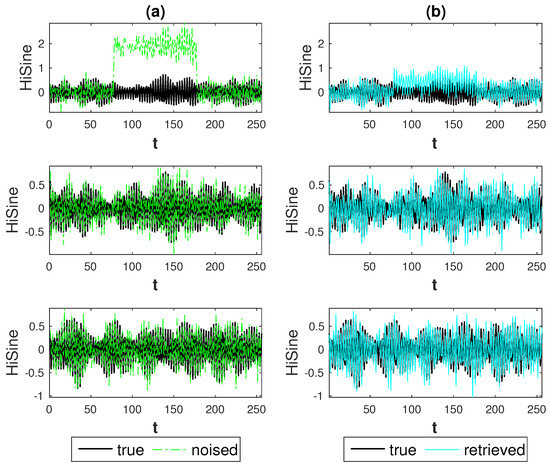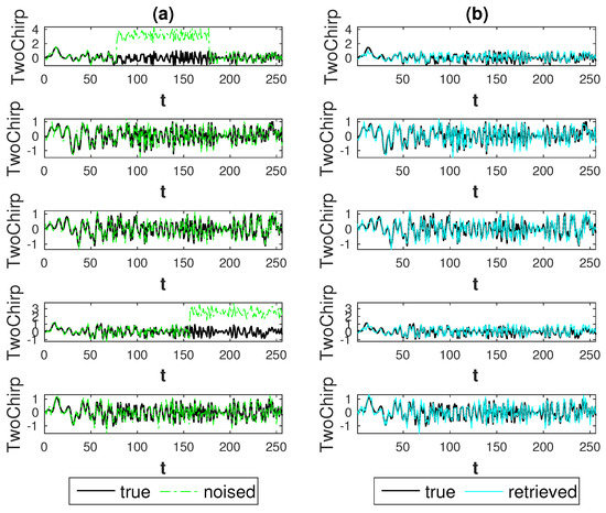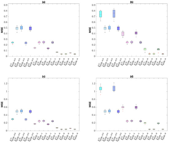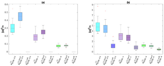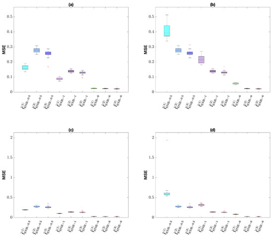 To summarize, for each of these two settings ( and ), we analyzed two different levels of anomalies ( and in Formula (17)) and three different levels of SNR ( and 6). These choices are arbitrary but they were dictated by the idea of understanding a sort of breakdown point of our procedure. Naturally, we expect that the weaker the anomalies and the stronger the noise, the worse the problem. Finally, we evaluated performance by computing the MSE for each signal’s component as