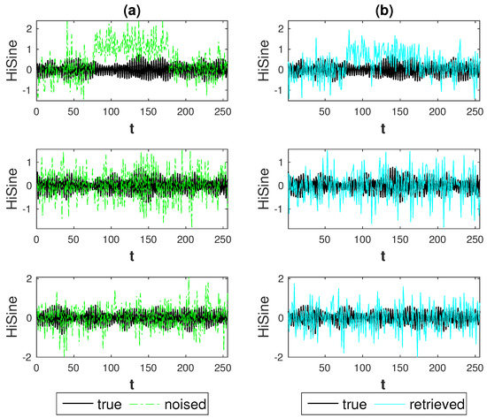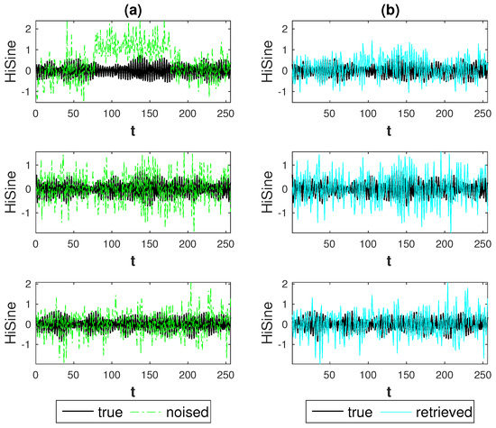 First setting: HiSine signals, strong anomaly (), lowest noise level (). Result for Hard thresholding procedure: (a) true signals (black) and noised signals (green); (b) true signals (black) and retrieved signals (cyan).