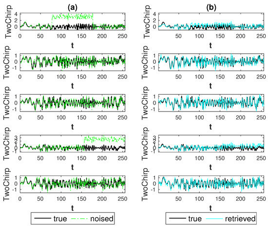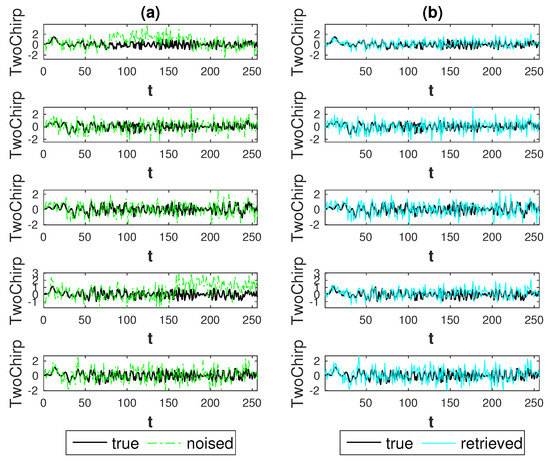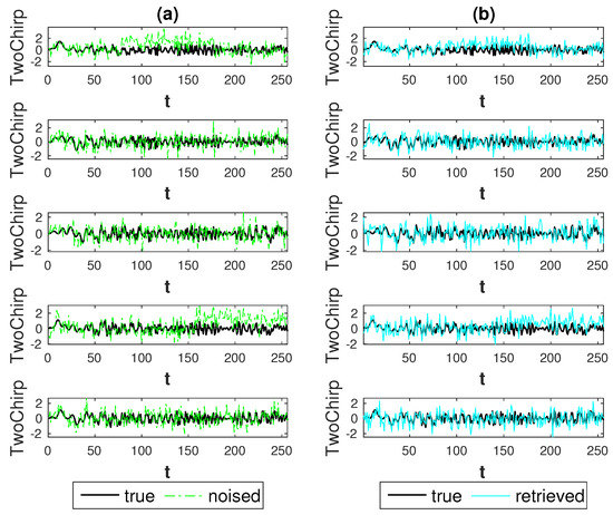 Second setting: TwoChirp signals, strong anomaly (), lowest noise level (). Result for Soft thresholding procedure: (a) true signals (black) and noised signals (green); (b) true signals (black) and retrieved signals (cyan).