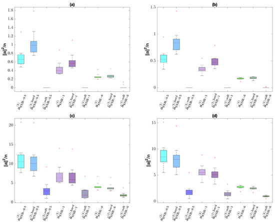 As regards the estimation performance, we observe that for both procedures, Hard and Soft, and both settings, , and , it decreases when increasing the level of noise (i.e., decreasing the SNR). In fact, the significantly decreases when moving from the left to the right in all box-plot shown in Figure 4 for the first setting and in Figure 10 for the second setting ; panels (a)–(c) refer to Hard thresholding for and , respectively, and panels (b) and (d) refer to Soft thresholding for and , respectively. Interestingly, in line with what we observed on the detection performance results, we have significant differences in terms of MSE performance on the anomalous channels between the Hard and the Soft. See box-plots in positions 1, 4, 7, corresponding to the first channel for the signal and box-plots in positions 1, 4, 6, 9, 11, 14, corresponding to the first and the fourth channels for the signal. The anomalous channels always have a better MSE for the Hard than for the Soft. This is a direct consequence of our double-step procedure: when we correctly detect the anomaly (in the first step), we correctly adjust the residual (in the second step) and hence we obtain a better estimation. On the channels without anomaly, detection performance is comparable.