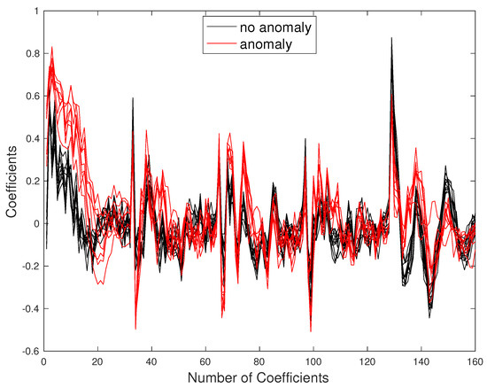 To illustrate the performance of our procedures on a real example, we considered the problem of detecting anomalies for signals recording measurements on a water pump. The signals represent the behavior of the pump in both normal and abnormal conditions and a complete description of it is given in [29]. The dataset is part of a repository managed by the Delft University of Technology and is freely available at http://homepage.tudelft.nl/n9d04/occ/index.html (accessed on the 18 February 2021) (dataset 541: Delft pump AR app). Each signal has a length and has been obtained by first fitting an AutoRegressive model of order 32 (AR(32)) to each of 5 vibration measurements and then by combining the coefficients in a single vector.