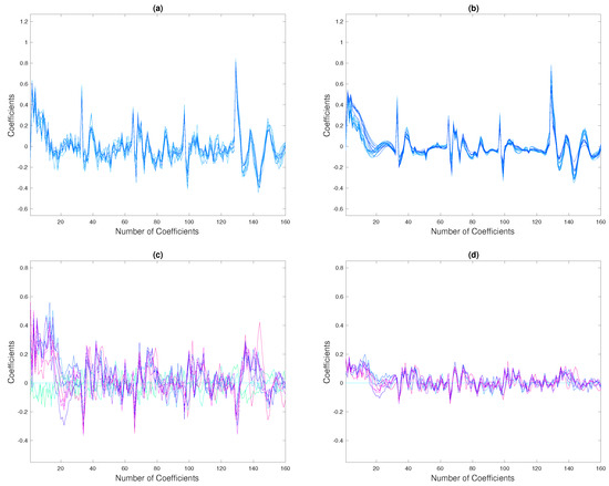 to represent situations where the mean of the signal undergoes to a shift during a specific interval of time ; where the shift with , to mimic situation where the anomaly is weak or strong with respect to the underlying signals. We generated data according to model (1), building K signals, of length and for such a choice the W matrix has dimension . Each signal has been generated randomizing the original signal ( or ) by the formula , where u is a vector of i.i.d. variables with distribution . These generations guarantee that the true underlying signals have similar shape and the same sparsity patterns. According to the model in Equation (1), we added noise to each channel as with related to the variance of the true underlying signal realizing three different type of to mimic situations of different severity of noise. For completeness, here is the expression