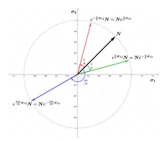 where is a geometric rotor (or simply a rotor) [33] and is a vector. In Equation (14), left-multiplying produces opposite effects compared to right-multiplying. Figure 1 shows a graphical representation of a vector left-multiplied by a rotor with positive angle . This operation produces a rotated vector (in green) in clockwise direction. Similarly, the same vector right-multiplied by the same rotor produces a rotation of degrees in the counter-clockwise direction (vector in red).