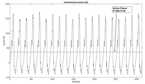 Figure 4 shows the voltage and current spectrum for the first fifty harmonics (for the sake of clarity, the fundamental component is not shown). The fifth and seventh harmonic voltage components were prominent, while even harmonics were insignificant due to the half-wave symmetry of the waveform. From Table 3, it can be concluded that most of the energy was concentrated in the first five odd harmonics. The RMS value of the voltage was 234.011 V, while that of the current was 2.618A. Figure 5 shows the power waveform, as well as the value of P (359.15 W).