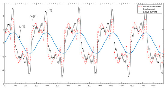 where is the geometric counterpart of the scattered current [39], which can only be compensated by using active elements, while can be compensated by using both passive and active elements [37]. There have been different attempts to give physical meaning to these current components. For that purpose, the scattered power could be defined as , while reactive power as . However, it has already been demonstrated that this decomposition has no real physical meaning (in the sense that these currents do not flow separately), even though it is useful for engineering practice [40,41]. In addition, for non-linear loads, the component is included to model current components with frequencies that are not present in the voltage: