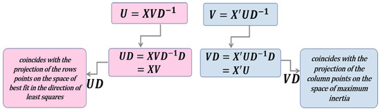 In the same manner, the row markers in the HJ biplot correspond with the row markers of JK biplot, and the markers for the columns coincide with the markers for the columns in a GH biplot, concerning the factorial axes. Figure 1 shows the relationships between and .