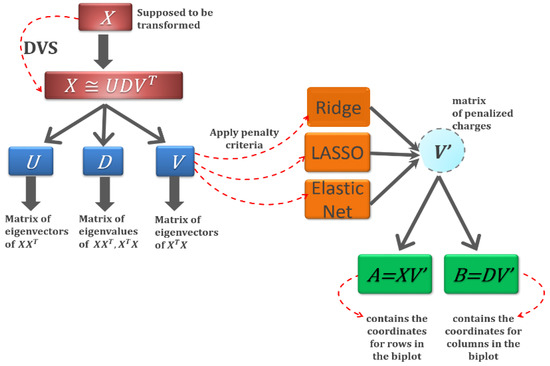 The following scheme (Figure 2) presents the steps describing the application of the regularisation methods in the HJ biplot, which leads to modified axes being obtained.