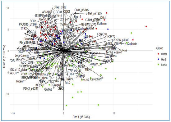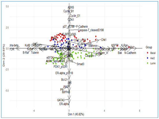 Finally, the SparseBiplot (Figure 5) shows an interaction between proteins and cancer types, that is clearer and easier to interpret. It shows that the variables that contribute negatively to the second axis have higher values for cancer type Luminal A. On the contrary, the proteins that contribute positively to the second axis have a higher value for cancer type Basal, and average values in Her2 type cancers. Axis 1 is a highly informative gradient (45.8%); and collectively with axis 2 captures approximately 75% of the variability of the data. The interpretation of the SparseBiplot makes possible the recognition of a proteomic characterisation of each of the groups, starting from a set of original proteins since the rest have obtained null loadings.