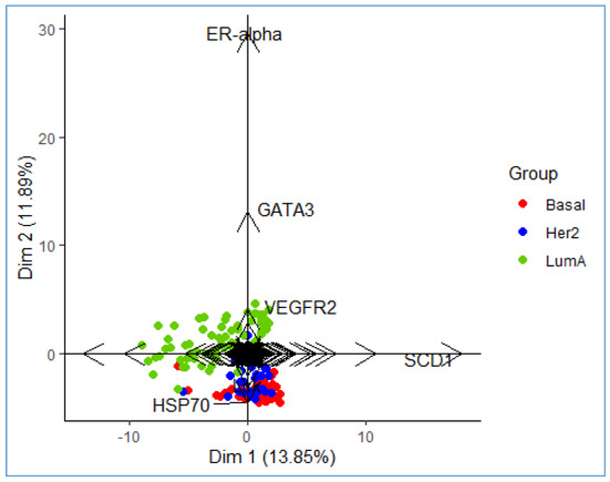 The disjoint biplot was realized with the help of the biplotbootGUI package, the data were analyzed by performing 1000 iterations of the algorithm obtaining the graph shown (Figure 4). The DBiplot shows a better structure in terms of interpretation, although the cancer–protein interaction is quite poor. A common characteristic of this technique is that most of the variables contribute mainly to the first axis.