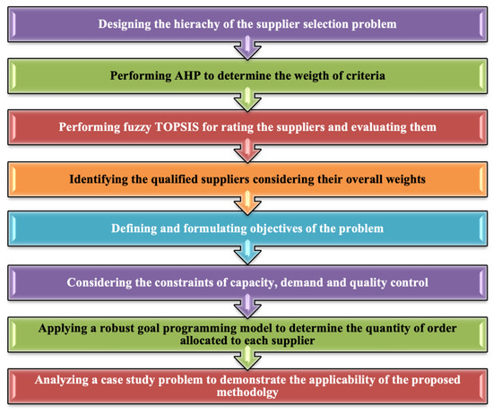 In this section, the proposed integrated approach for GSS is presented based on AHP-fuzzy TOPSIS and RGP. The analytic hierarchical process (AHP) is used for the calculation of relative weights of the supplier selection criteria; the fuzzy TOPSIS is used for rating the suppliers according to the selection criteria; finally, the weight of each supplier is identified. Then, the problem is formulated as a bi-objective model based on real-world assumptions and limitations, in order to determine the optimal values of the decision variables, which are described in Section 3. To cope with two objectives of the problem under uncertainty of the demand parameter, an RGP technique is applied to the model. This technique guarantees feasibility, robustness and optimality of the solutions [37]. Figure 1 depicts the proposed method.