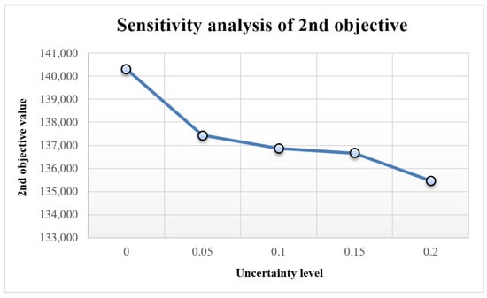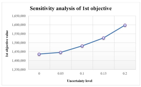 There are different methods to deal with the uncertainty. In this paper, the interval-based robust optimization method based on the Bertsimas and Sim model is used, because it offers a linear model that outperforms the others [45,46]. Accordingly, the demand parameter is considered uncertain; i.e., it is defined as the interval in which is the average demand of item r, and is the deviation rate of demand of item r. Here, is defined according to the uncertainty level , determined by . This parameter leads to uncertainty in the maximum acceptable defect rate and constraint and the calculation equation of the order quantity. The corresponding equations with uncertainty are: