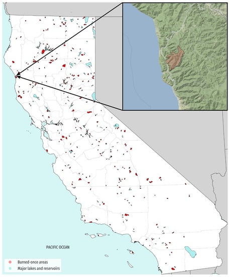 Map of California and the perimeters selected for this study. The upper right corner shows the perimeter of the MEU LIGHTNING COMPLEX (MIDDLE) wildfire in June 2008. The figure was generated using geopandas [27], and the data of the polygons was obtained from the Monitoring Trends in Burn Severity (MTBS) program [24], and polygons of the state and major lakes and reservoirs were obtained form the California Open Data Portal https://data.ca.gov (accessed on 6 April 2020). The top right-hand side picture was created with the contextily Python package https://contextily.readthedocs.io/en/latest/ (accessed on 20 April 2021), using the Map tiles by Stamen Deisgn, CC BY 3.0—Map data (C) OpenStreetMap contributors.
