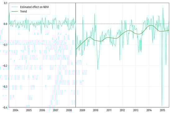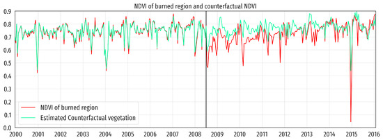 Figure 2 and Figure 3 illustrate, for the MEU LIGHTNING COMPLEX (MIDDLE) wildfire example, the effect estimation process performed in [18]. Figure 2 shows the observed NDVI as well as the estimated counterfactual vegetation index. The estimated effect is the difference between these two time series and it is shown in Figure 3.