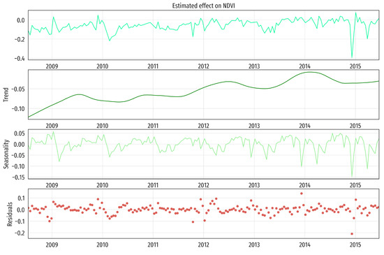 We use the LOESS implementation from the Python [35] library statsmodels [36] to extract the trend from the wildfire effects time series, removing the seasonal and the residual components at once. Figure 4 shows an example of the time series decomposition in the MEU LIGHTNING COMPLEX (MIDDLE) example. Figure 3 also shows (in dark green) the extracted trend over the estimated effect (in light green).