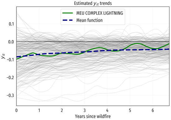 We start summarizing the functional dataset containing the 243 wildfire recoveries. Their mean function is represented in Figure 5, jointly with the complete dataset. The mean wildfire effect on NDVI is always negative for the 7 year period after the wildfire, and the absolute value of this negative effect is monotonically decreasing over time, going from at time 0 to seven years later, in terms of lost NDVI points, with a global average of . In average, the burned areas are progressively recovering NDVI points after wildfires (approximately 10% of the range of the functional data set values, see Figure 5). It is also noticeable that, on average, it takes more than 7 years for a complete recovery of the NDVI: the value of the mean function after 7 years is still negative. The library fda.usc [43] in R [44] has been used for the descriptive analysis, including the choice of the MEU LIGHTNING COMPLEX (MIDDLE) as an illustrative wildfire example, as it has the modal median recovery function in 2008 (the modal year).