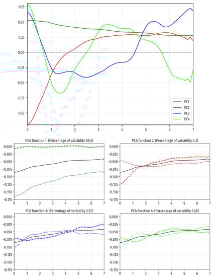 Next, FPCA has been applied to find the main modes of variation of the studied functional data around the average. Figure 6 shows the mean, and the mean plus/minus a constant times the first four principal functions, that have been computed using the function pca.fd from package fda [45] in R, as described in Section 3.2. In particular, the number of functions in the B-spline basis has been and the penalty parameter . These choices have been determined when using the function fdata2fd from library fda.usc with default parameters to transform the raw functional data into a fd class object of library fda.