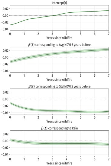 The main goal of this study is to quantify the influence that different pre-wildfire conditions (geographical region, climatological conditions, or vegetation types) of the burned areas have on wildfire effects over the subsequent years post-wildfire. In order to achieve this goal, function-on-scalar additive models (of the type from Equation (2)) are fitted using the function pffr from the library refund [46] in R. The list of potential covariates to be included in this model is given in Table 1. The number of functions in the B-Spline basis in all of these fitted models are the default values suggested by the pffr function: 20 for the functional intercept , 5 for smoothing terms depending on t (for instance, and in model (2)), and 10 for smoothing terms depending on other covariates (for instance, and in model (2)). Notice that terms as need two bases, one in the dimension of t and the other in the dimension of the explanatory variable .