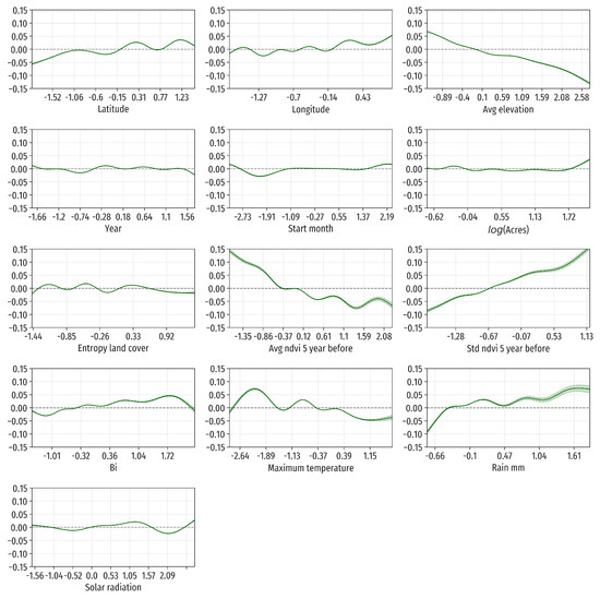 Lastly, we do not find clear and strong interpretable patterns of dependence between the response, the wildfire effects functions, and the rest of covariates (year, start month, log(acres), entropy land cover, and solar radiation).