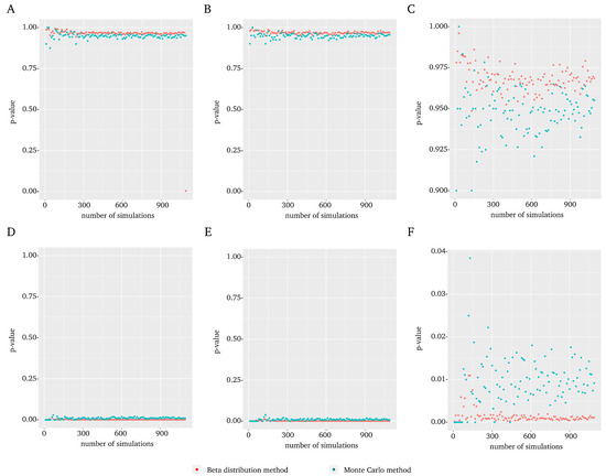 A representative example of the results is included in Figure 1 which shows the results of the MYC gene in experiment 1 (all results for each gene in each experiment are included in the Supplementary Material). In general, no differences were observed when using the t-Student distribution (Figure 1A) vs. normal (Figure 1B) distribution. On the other hand, major differences were found when the between-pair randomization (Figure 1A,B) was compared to complete randomization (Figure 1D,E). Regarding the number of simulations B (Figure 1C,F), the Montecarlo shows a greater variability than the beta distribution. Furthermore, it is not necessary to perform a large number of simulations to reach a value similar to the one obtained with the maximum evaluated. Indeed, from a small number of simulations and up, the value remains sufficiently stable.