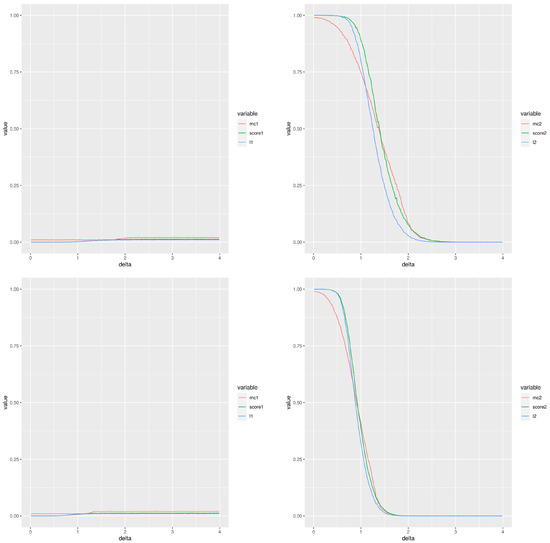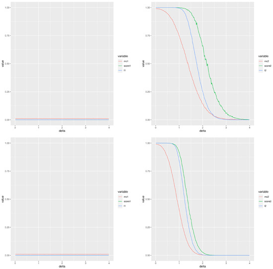 The parameters were estimated using two methods: The maximum likelihood estimator and the moment estimator [11]. Both estimation methods were implemented in C++ and included as part of an R-package publicly accessible. Furthermore, it is possible to obtain a confidence interval for the score defined in Equation (7) by using the delta method ([12], p. 587). The confidence region for will produce a confidence interval for given by