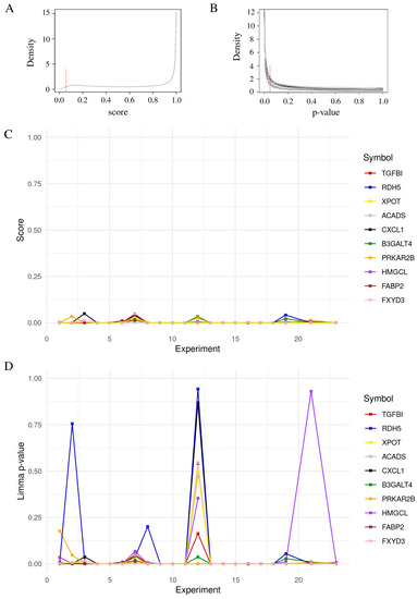Comparison between common significant genes using the moderated p-value and our score. The 18 genes were reported with a score < 0.05 and with a moderated p-value . The cut off for score (A) and moderated t-test (B) are indicated by the vertical red dashed line in the density plot. All genes were represented across the 21 datasets with the corresponding score (C) and p-value (D).