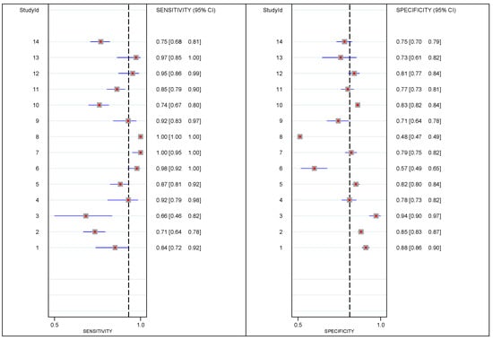 Conversely, Figure 2 reveals how the different values of sensitivity and specificity are located below or above the dotted line (the average), indicating the presence of strong heterogeneity in both measures. That is, the graph demonstrates different values of the test performance means toward higher sensitivity and lower specificity, providing indirect evidence of certain heterogeneity threshold variability.