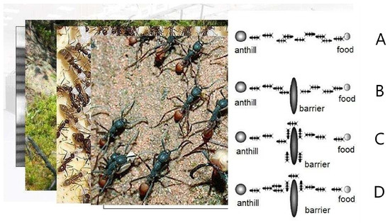 Let us suppose that a new way of food supply is needed since the anthill neighborhood is destroyed through some catastrophic event. A strategy intended to resolve this problem can consist of ants spreading in all possible directions chosen, for example, randomly (a randomized strategy). Let us explain an example shown in Figure 1. Line A shows the situation when there are no obstacles on the way from the anthill to the food. On line B, the barrier (obstacle) appears. For example, it can be a fallen stone. In this case, ants start to avoid the obstacles in two ways, as shown in line C. After some time, according to the algorithm described in [15], all ants start to move only as is illustrated in line D since it is the shortest way. This scheme makes it possible to discover and optimize new food paths. Thus, the system possesses emergent intelligence properties.