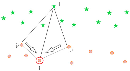 As before, denote by a set of all neighboring agent of an agent i at time instant t and by () the set of neighbors whose data the robot i will receive over the network. The maximal number of elements is selected based on the performance of the data transmission module, but it cannot be more that . If , then the data of all neighbors are taken into account; if , then the neighbors are chosen randomly. There are several algorithms intended to the searching technique used to detect and select the nearest neighbor (see [30]). In this work, we apply the following approach employing the strength of the received signals: