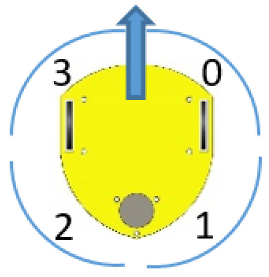 If there is no light source, then robots do not move. Otherwise, each robot travels with a given speed in the source direction, intending to reach it, bypassing encountered obstacles. More precisely, let , and be fixed numbers, and be common predefined parameters of navigation protocols for each robot, and be the operator of vector rotation by angel . The distance-sensor measures the distance to the nearest obstacle (along the axis of the motion), and the light sensors provide the data about illuminations. Each light sensor is oriented to the direction of corresponding corners and has a range . At each time instant t, robot i calculates a path direction vector to the light source by light sensors data and magnetometer data (azimuth—the angle between the first axes and direction to the Nord). Let be an order of the light sensors according to decreasing order of light power . Path direction is calculated by the magnetometer data and the proportional difference between two largest values of light values ( and ) with the corresponding shift to the sector defined by and . For example, if the most significant light values are equal, then the robot moves straightforward.