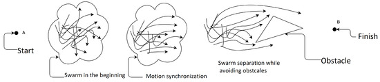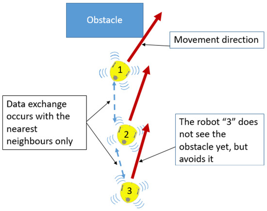 The described algorithm demonstrates that each robot operates according to a well-defined procedure without knowing its location and the location of its neighbors in the global system. A robot is only aware of its neighbors’ states, their path direction, and confidence correcting their own path direction resting upon these data. An idea of this algorithm is shown in Figure 6. An example of three robots group exhibits that the robot moving last bypasses obstacles along the optimal route. Note that it does not recognize these obstacles but is guided only by its neighbors’ data (Figure 6).