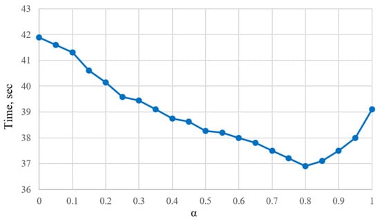 The step-size parameter plays an essential role in the algorithm. Therefore, we check its possible values lying in the interval with step and start point 0 and evaluate the appropriate times needed for all robots to reach the opposite wall. For the purity aim, for each given value of , ten experiments are provided, and the average time is calculated.