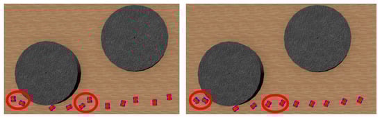 Screenshots of the simulations. The robots are depicted as red rectangles, obstacles as gray circles. The left side presents the simulation without Local Voting Protocol (). In this case, robots do not keep the distance between them. The right side presents the simulation with step-size parameter of the algorithm from Section 4.1, where the robots keep the distance and avoid collisions.