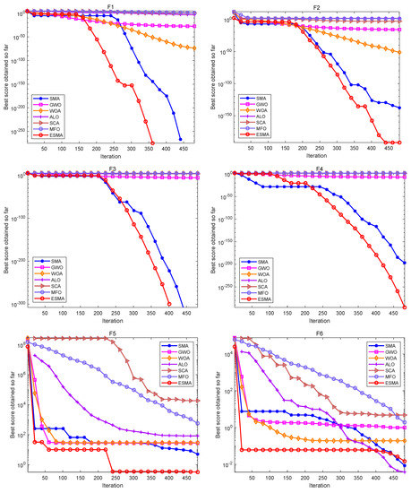 As shown in Table 6, for the unimodal test functions, namely, F1–F7, the ESMA can accurately obtain the optimal value of the test functions on both F1–F4, showing good optimization performance. The ESMA is slightly inferior to ALO on function F6, but obviously superior to it on other unimodal test functions. For the multimodal test functions, namely, F8–F13, the ESMA can also accurately obtain the optimal value of the test functions on F9 and F11, and it is obviously better than other algorithms on other test functions. For the low-dimensional multimodal test functions, the ESMA can also accurately obtain the optimal value of the test functions on F14, F16, and F18, and the optimization results of the seven algorithms on F16 and F18 are basically the same. On function F16–F19, the mean value of the ESMA and MFO algorithm is the same, but the standard deviation of the ESMA is slightly lower than that of the MFO algorithm. The ESMA is obviously better than other algorithms in other low dimensional multimodal test functions. Considering all the test functions, the standard deviation of the ESMA is small, so it is relatively stable on the test functions. According to the final ranking, the ESMA performs well in the 23 benchmark test functions.