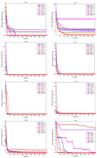 Convergence curves of the ESMA and other algorithms on fixed-dimensional multimodal functions.