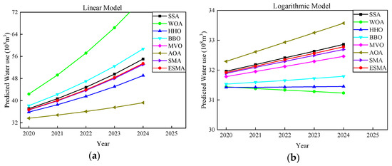 Comparison for predicting water demand from 2020–2024 based on four models: (a) Linear model; (b) Logarithmic model; (c) Exponential model; (d) Hybrid model.