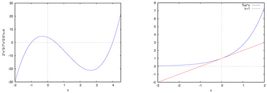 Figure 1. 2D plot outputs of a cubic function y = f ( x ) = 2 x 3 7 x 2 5 x + 4 (left), and the exponential function y = g ( x ) = e x and its linear approximation at ( 0 , 1 ) , y = L ( x ) = 1 + x (right).