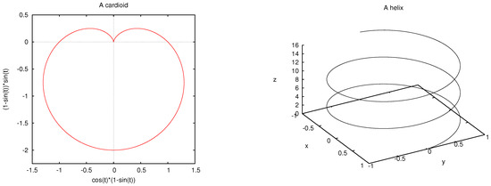 Figure 2. (left) The output of 2D parametric plot showing a polar curve cardioid r ( t ) = 1 sin t , 0 t 2 π . (right) An output of a 3D parametric plot displaying a vector-valued function helix r ( t ) = cos t , sin t , t , 0 t 5 π . These particular cardioid and helix are symmetric with respect to the y- and z-axes, respectively.